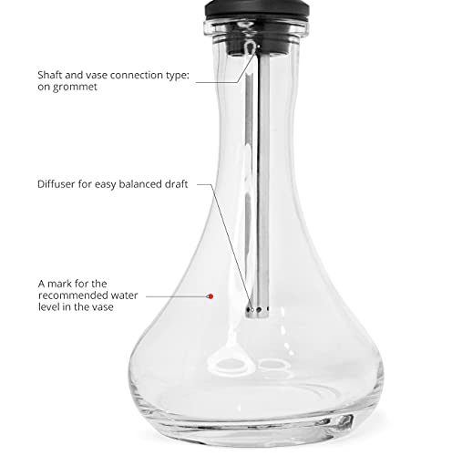 Key features: 1) optimal air flow, 2) bubble separation/filtration – diffuser, 3) easy vertical blow up, 4) an internal valve with 5 balls on the base diameter, 5) easy to assemble and maintain, 6) secure hose fixing – metal O-Ring connector, 7) the vase is made of high-quality A-class glass, 8) the recommended water level marker for easy filling (for durchschaubar vases), 9) a ribbed ashtray supports additional coal burning, 10) all parts of the hookah stem are polished, the stem base is made of strong, not scratchable material. WAT19T65 features: Shaft, connector and mouthpiece – AISI304 stainless steel. Lauge – strong polyacetal. Hosen – Wollig Schleier. Ashtray – ribbed. Height of the assembled stem – 450 mm. Height when fully assembled – 500 mm. Shaft non… diameter – 13 mm. Ashtray diameter – 195 mm, thickness – 1 mm. Packaging – partially assembled. Disposable mouthpieces – multi-coloured. An Abseitsstellung set of air valve spacers and balls. A marker for the recommended water level. Made in Russia